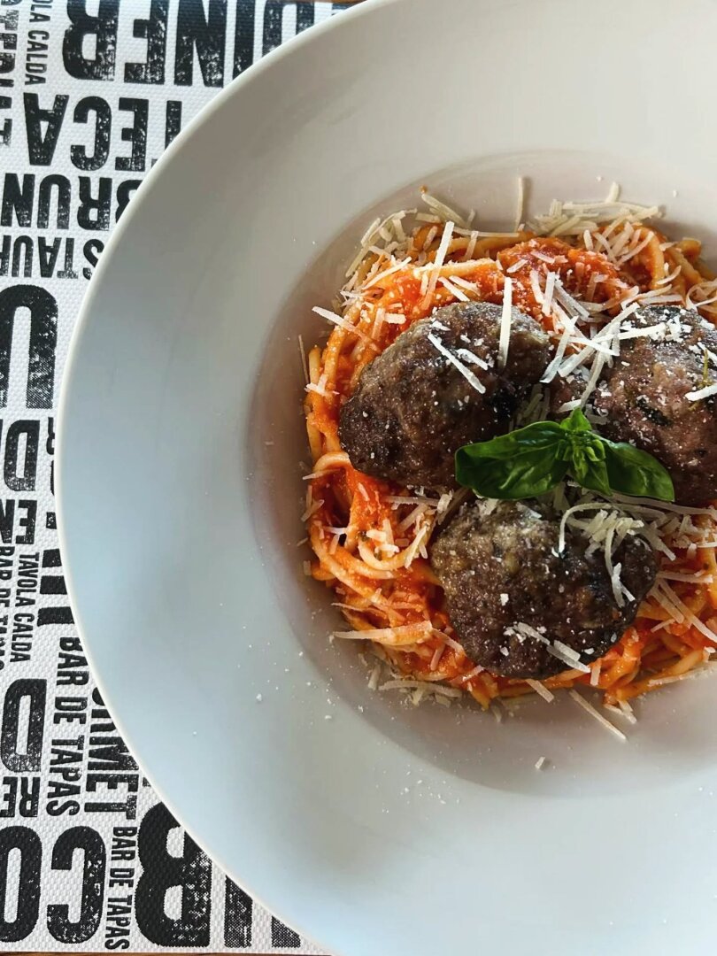 SPAGHETTI AGLIO E OLIO, GRILOVANÉ KREVETY, CHERRY RAJČÁTKA, PETRŽEL